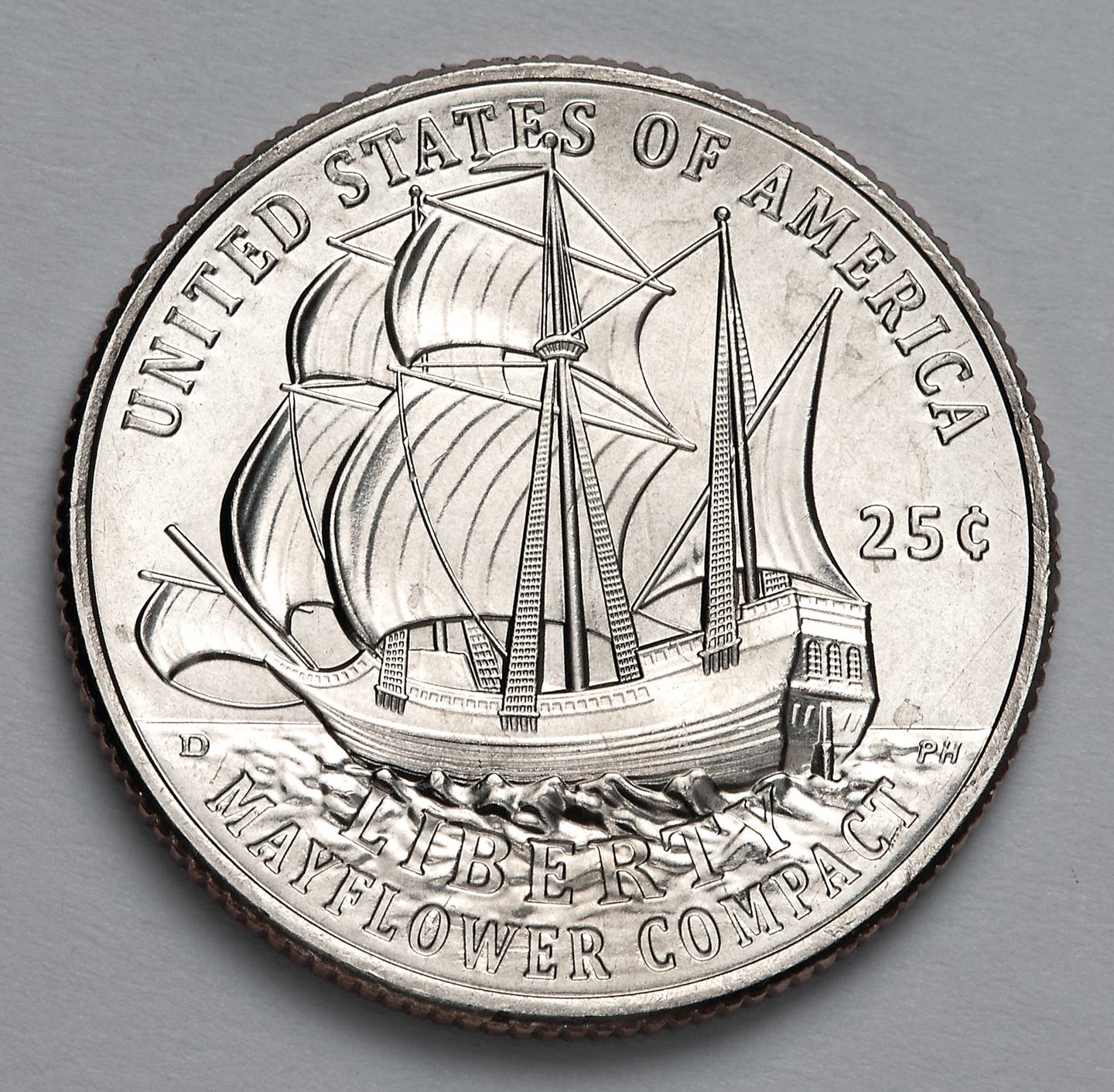 The first of five newly designed quarters to celebrate the USA’s 250th anniversary, this coin features a Pilgrim couple facing West on the front, or obverse. The Mayflower ship, on which early English settlers journeyed in search of religious freedom, is the design featured on the back (reverse).