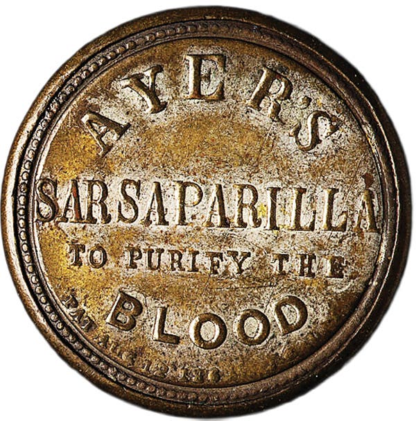 Gault took advantage of the holders in which the stamps were housed, selling advertising space in raised lettering on the metal jackets holding the stamps. Among Gault’s advertisers were Aerated Bread Company, Ayer’s Sarsaparilla and Cathartic Pills, Joseph L. Bates Fancy Goods, Buhl & Co. Hats and Furs, Burnell’s Cocoaine, Drake’s Plantation Bitters, Ellis McAlpin & Co. Dry Goods, Lord & Taylor, Sands Ale, Tremont House, and White the Hatter. The advertisers ranged from New York to Cincinnati.