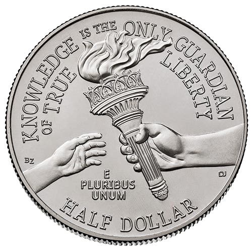 The half dollar’s obverse design shows a close-up of the Statue of Liberty, her gaze looking outward towards the future. On the reverse, Liberty passes her torch to the new generation.