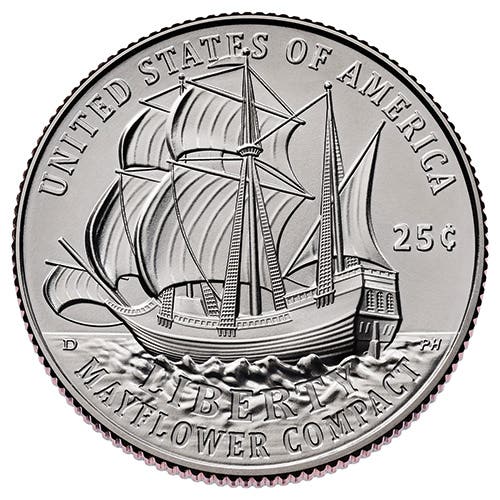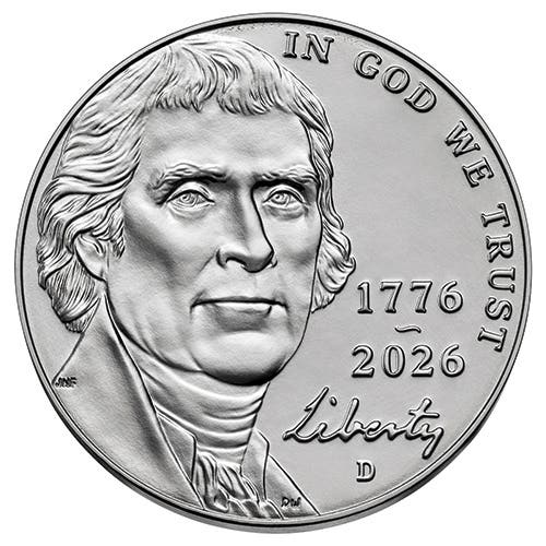 The five quarters will feature designs honoring the Mayflower Compact, Revolutionary War, Declaration of Independence, the U.S. Constitution, and the Gettysburg Address. Additionally, the new dime will feature Lady Liberty with her liberty cap on the obverse and an eagle in flight carrying arrows in its talons on the reverse. The nickel will include the 2006 forward-looking Jefferson design with 1776-2026.