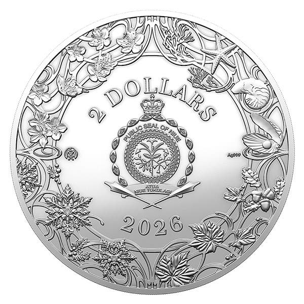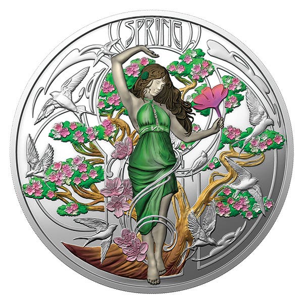 The Lithuanian Mint is welcoming spring with the last coin of its “Four Seasons” series. Presented in a colorized silver $2 coin for Niue, the end of winter and the rebirth of warmer weather, florals, and greenery are shown through an embodiment of a “Mother Nature”-like figure.