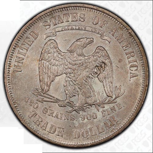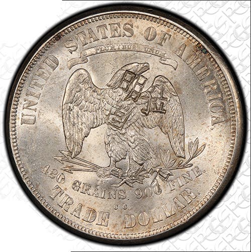 Their rarity is due to two factors: the China trade and extensive melting. In total, there were 35,958,460 business-strike Trade dollars produced at the Philadelphia, Carson City, and San Francisco Mints from 1873 to 1878. Of those, there were 6,607,632 that remained in the U.S. However, after the coin was terminated in February of 1878, agitation began with the goal of redemption of Trade dollars at par, even though the price of silver was dropping. To that end, between the years 1879 and 1881, there were 2,074,812 Trade dollars repatriated from East Asia.