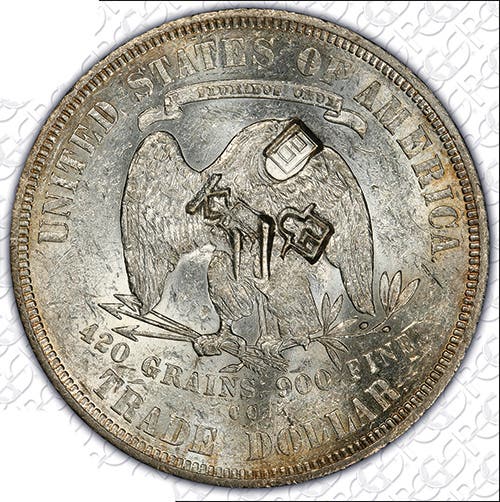Above: An 1873-CC Trade dollar “Chop Mark” graded AU58 from the David Reimer PCGS Registry Collection of finest chop-marked Trade Dollars. Reimer writes, “With a mintage of only 124,500, the 1873-CC is one of the keys to the series, chop marked or not.” (Photo courtesy PCGS Registry Sets.)