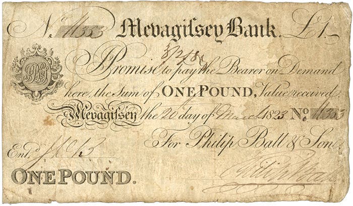 This section of the sale also offered a collection of English and Welsh provincial bank notes, mostly from the early 19th century. According to Gladdle, the sale of the English provincial notes was not as strong as 20 years ago, but the pieces of the Backhouse series, which included banks in cities in the northeast that were incorporated into Barclays (lots 137 to 147), performed well. As did a Cornish £1 bank note for Mevagissey that was issued in 1823 (lot 103), which sold for £431.