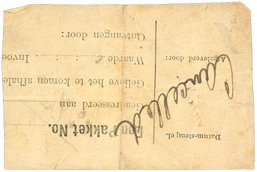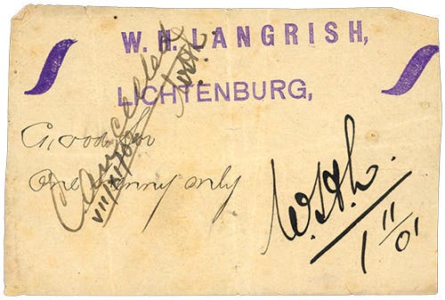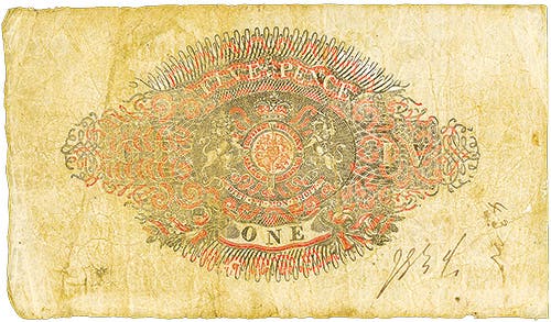 “Lichtenburg, between Pretoria and Mafeking, had become a British garrison deep in Boer territory,” says Gladdle. “The Boers had made a determined effort to take the town earlier in March that year but failed. Boer resistance dragged on for another couple of years, and it was during this time that W. H. Langrish, the general store in Lichtenburg, issued this crude penny note on the 1st of November 1901—which was cancelled a year later in November 1902 a few months after hostilities had ceased.” The very rare emergency bank note realized £1,599, including commission.