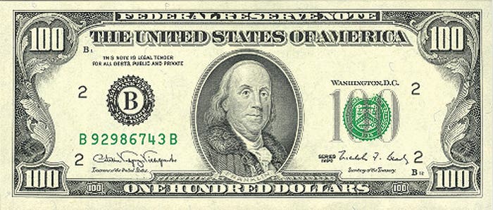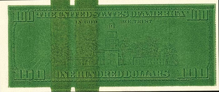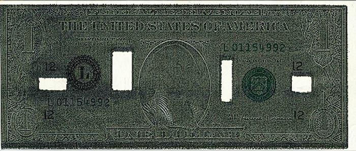 A pair of total over-inked notes. Left: Fr. 2180-F 2006 $100 FRN. The back of this $100 note is completely flooded with green ink. Right: Unique "California Blackout" note. Fr. 1925-L* $1 1999 FRN. Coin World stated that a Treasury official confirmed the item as a test note, which is produced to make sure the face plates are completely inked before starting a run. The four blank squares are portions of the plate that require no ink, as no intaglio print is in that area of the plate. It is puzzling how this made it out of the BEP. Sold for $10,062.50 in a Heritage September 2006 auction.