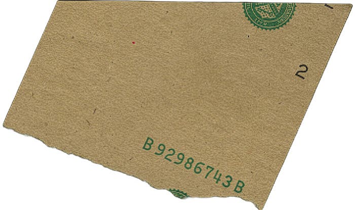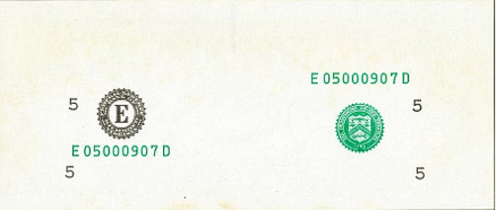 Fr. 1978-G 1985 $5 FRN. A piece of masking tape made its way onto the note before the third printing. It contains the full left serial number, the green Treasury seal, and three "7" district numbers.