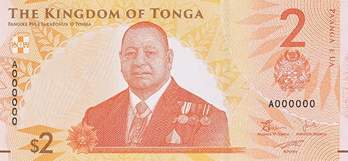 2023 2 pa`anga issued by the National Reserve Bank of Tonga. P#50. Photograph courtesy of the National Reserve Bank of Tonga.