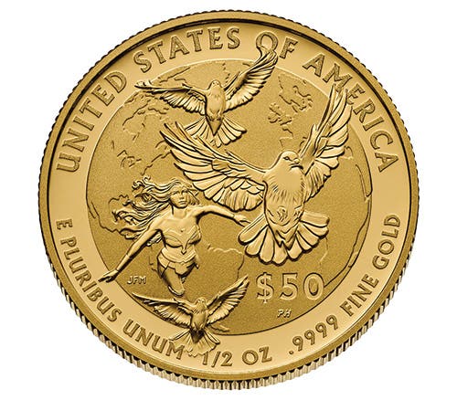 On the obverse, Wonder Woman leaps across the coin with her shield and Lasso of Truth. The background features stripes from the American flag. On the reverse, she soars above the earth alongside three doves, symbolizing her commitment to peace, equality, and justice