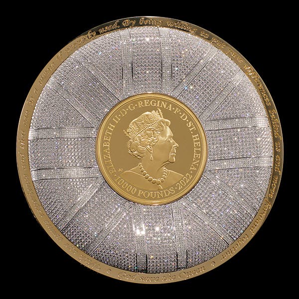 Stanley Gibbons Baldwin’s will auction The Crown Coin: Her Masterpiece—widely hailed as the world’s most valuable coin, a dazzling tribute to Queen Elizabeth II in gold and diamonds.